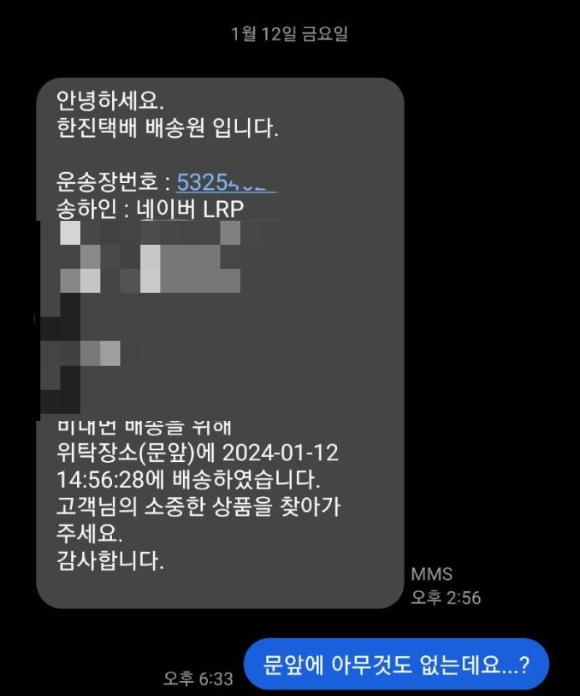 그러나 B씨 집 앞에는 아무것도 없었고 이에 B씨는 같은 날 오후 6시 33분쯤 '문 앞에 아무것도 없다'라는 답장을 보냈다.