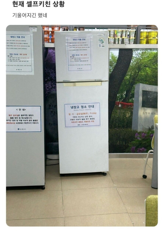 작성자는 우정원 건물 지하 1층에 있는 셀프키친(주방) 바닥이 기울어져 냉장고가 기울었다고 전했다. 함께 올라온 사진 속에는 냉장고가 기울어져 있는 모습이 담…………