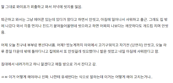 외출 후 씻지 않는 아내 때문에 고민이라는 남편의 하소연이 화제가 됐다.