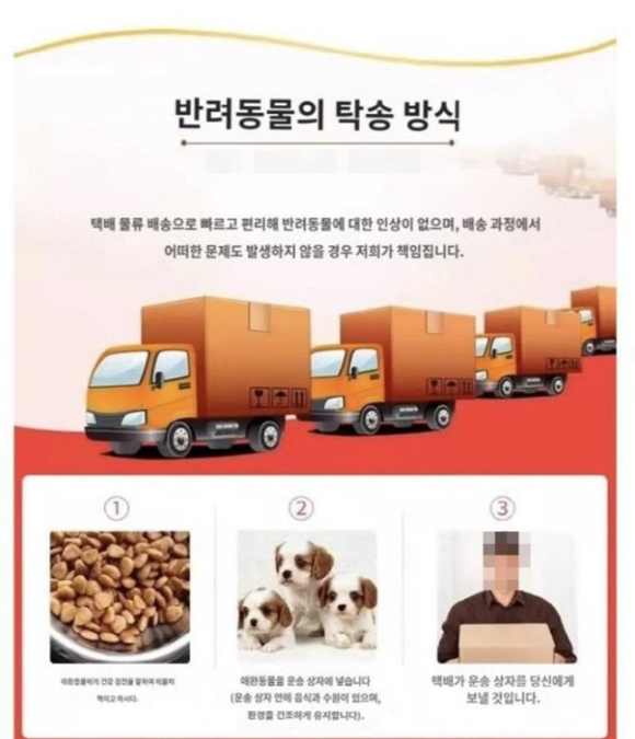 판매자는 상세 페이지에서 강아지를 운송 상자에 넣어 택배로 보내는 '반려동물 탁송 방식'이라고 안내했다. 아울러 "택배 물류 배송으로 빠르고 편리하다"며 "배송 과정에서 어떠한 문제가 발생할 경우 저희가 책임진다"고 덧붙였다.