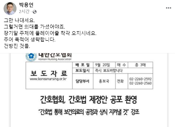 그러나 박용언 대한의사협회 부회장은 이날 사회관계망서비스(SNS)를 통해 환영 성명을 낸 간호협회를 비난했다.…………