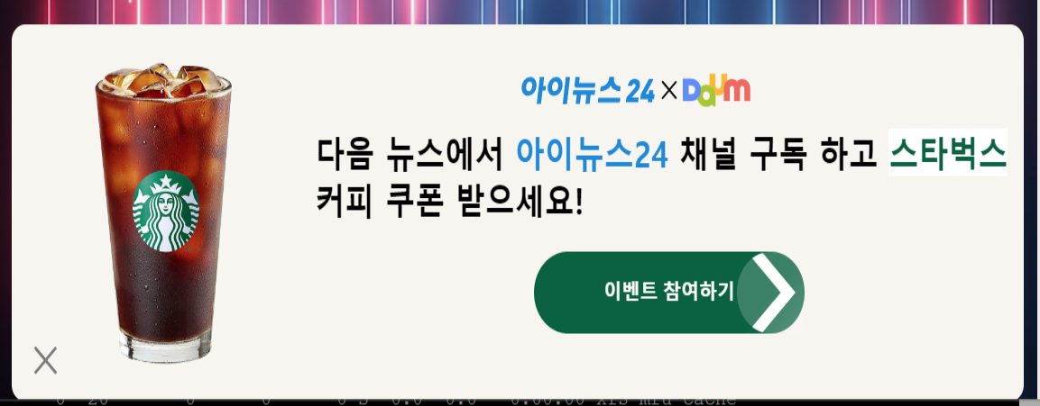 다음 My뉴스에서 아이뉴스24를 구독해 주신 분들 중 추첨을 통해 100분께 스타벅스 커피 쿠폰을 드립니다.
