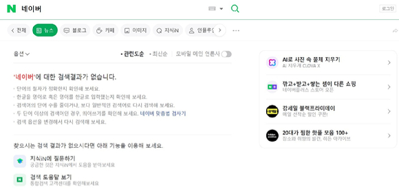 "내부 시스템 설정 오류"…22분간 뉴스 검색 결과 미노출 현상 나타났다가 정상화 6일 오후 네이버 뉴스 검색 결과가 노출되지 않는 문제가 22분간 발생해 이용자들이 불편을 겪었다. 현재 서비스